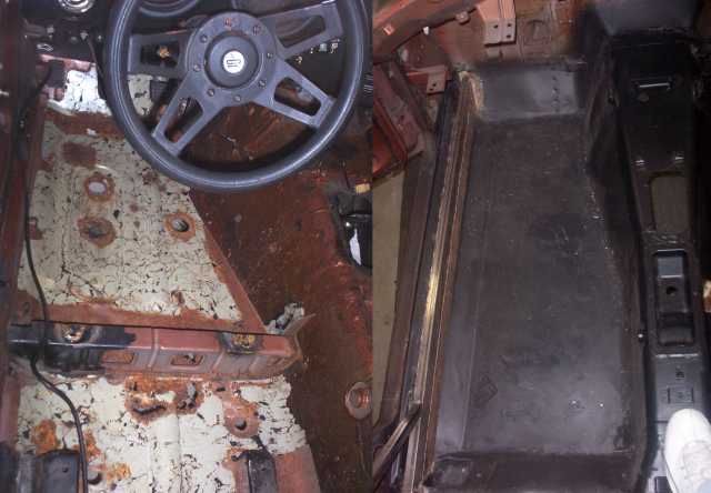 If the integrity of the seat mounts and frame rail is not affected by the rust, I'd patch. Especially if you're not worried about aesthetics. I replaced my Swiss cheese floors mainly because the rust was in all the edges of the rail underneath and the front seat mount. I also cut the roof off so I needed the floors to be solid along with the addition of stiffening tubing. It looks great, but it's a lot more involved than patching. I have a cheap flux core wire feed welder you can borrow if you'd like. It's what I used to do my floors.