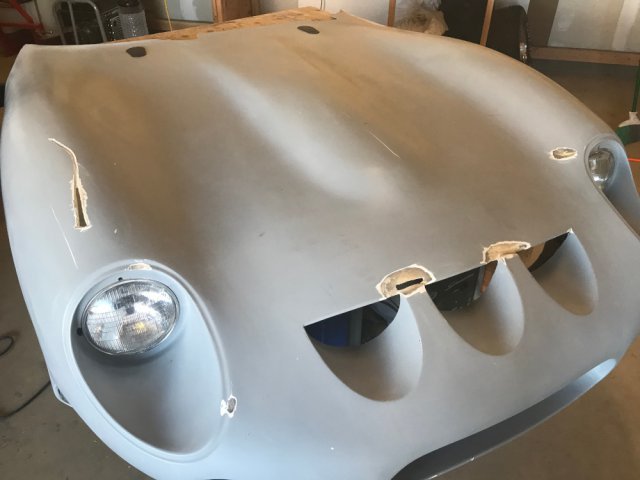 Well, a few things have happened since my last post. 1. I finally pulled the plug completely. I'm officially and completely retired. 2. I built an outdoor patio cover, which means we finally have some shade for those triple digit temperature we get for weeks on end... 3. and Christmas Village 2019 ( in 3D ) is finished. It's so big we had to use two rooms this year. With all that out of the way, I was finally able to begin making repairs to the VR. I spent today removing the bonnet, cutting out the damaged fiberglass... and prepping the repair areas for mat and filler. I'll be making new forms to rebuild the under hood extensions to the sugar scoops. Damn it feels good to be working on this again!!!