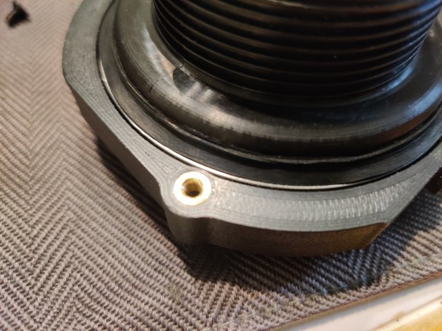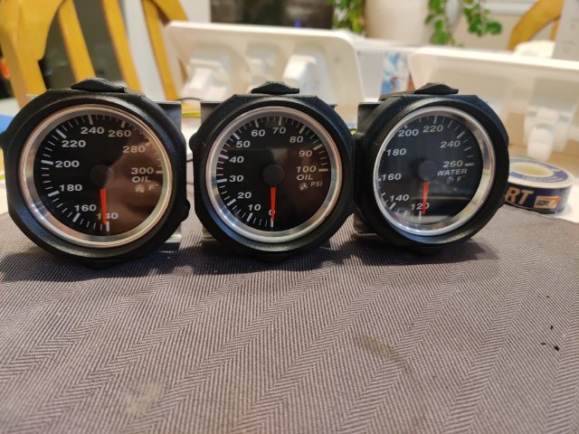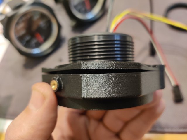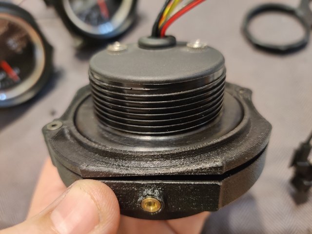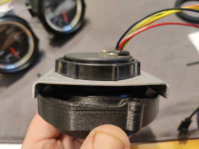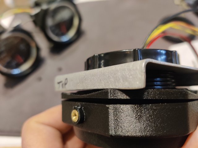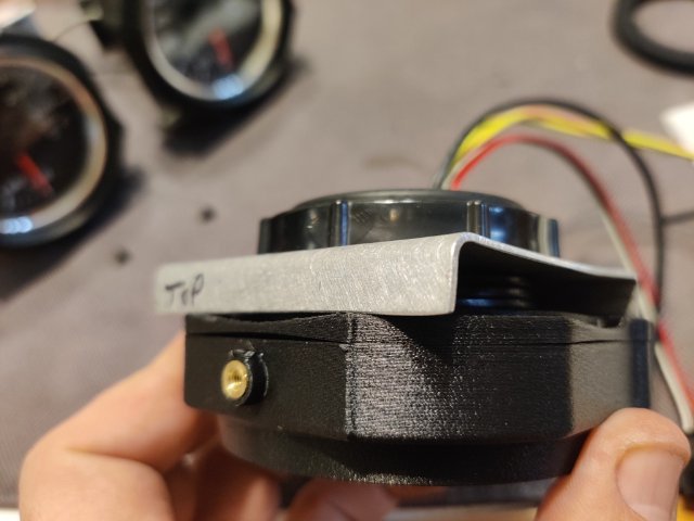 I purchased some gauge mounts for the three middle gauges in the dash from a seller on eBay. They are 3D printed items. The design is pretty good. The plastic seems sturdy. And they incorporate metal thread inserts. The screws have a taper head, so they self center, and fit of the various parts is very good. However, I found that the gauges were loose when fitted to the housings with the backplates (which hold them in the housings) bolted tightly in place. The gauges rotated easily in the housing as there was no clamp force against the back of the gauge to hold the gauge forward against the "stop" portion that the bezel of the gauge is supposed to fit up against. After thinking about solutions for a bit, I pulled out some ancient Goretex I have. Basically, it is rubber gasket material with an adhesive on one side. It comes in handy for a lot of things. In this case, I cut a strip and ran it around the back of the bezel on the gauge. I fitted the gauge and then pressed the backplates against the new rubber gasket. I then briefly removed the gauge and took this second picture which shows how the new gasket deformed under "crush". Third pic shows that as well as the metal insert in the gauge housing. Another issue to overcome though was that the backplate only has two screws to clamp it to the housing. After I put the gasket in place and assembled the gauge in the housing, the backplate only pulled tight against the housing where the screws are located. See the first and second pics just below. I realized that I could take the aluminum mounting brackets I had already made and flip them 180 degrees... and use the Speed Hut gauge mounting rings to resolve the situation however. See the third pic. These aluminum brackets ended up coming in handy. I simply screwed the Speed Hut mounting rings tight, which pushed the edges of the aluminum brackets against the plastic backing plate, which pushed against the points of the backing plate which were not against the back of the housing. So, with a redistribution of forces, I was able to resolve all the issues. I see now that I didn't take a picture of the other part of the gauge mounts. There is an arm that attached at the top and the bottom of the housing in the same fashion as with the stock 240z gauges. I hope I won't have any issues with that part, or with the gauge housings fitting in the dash holes. I will probably check that out this weekend.