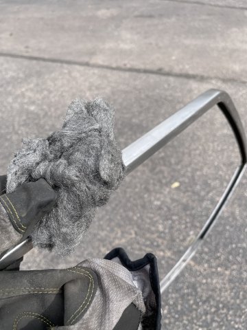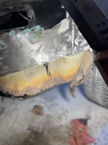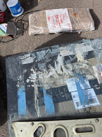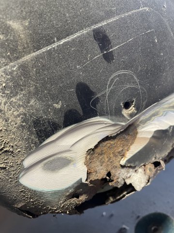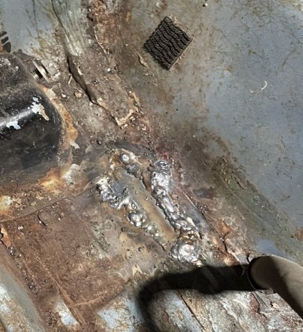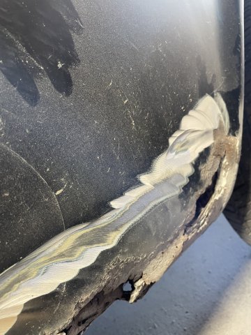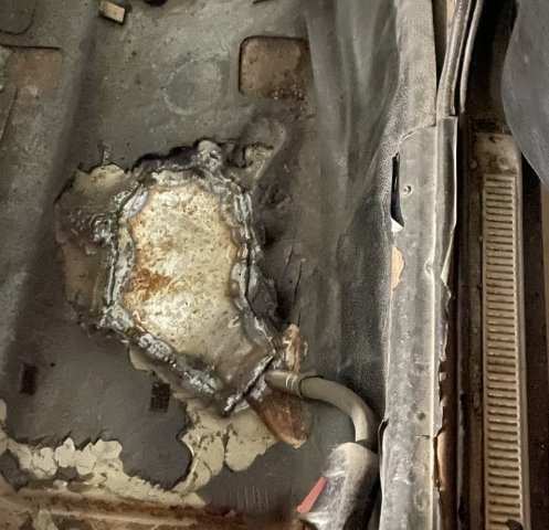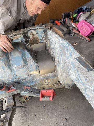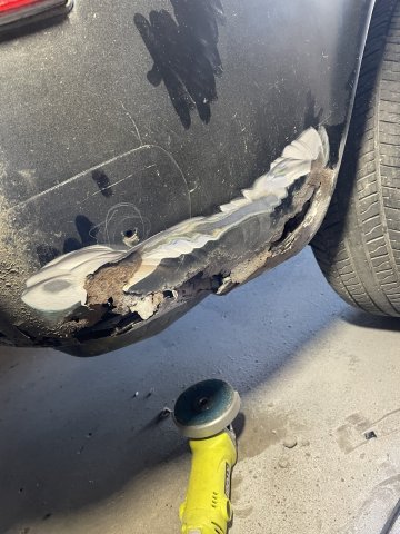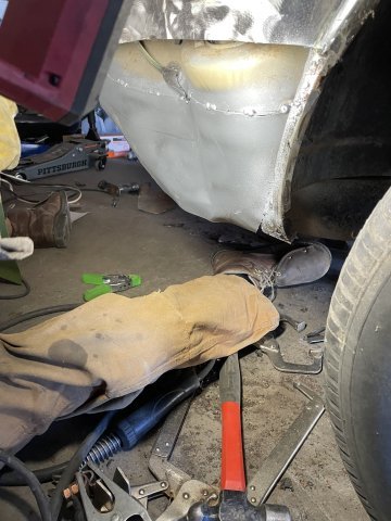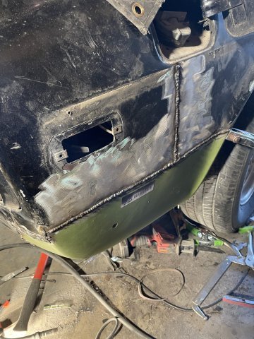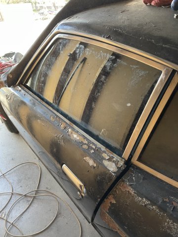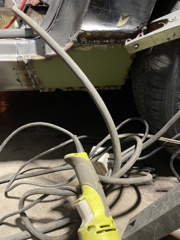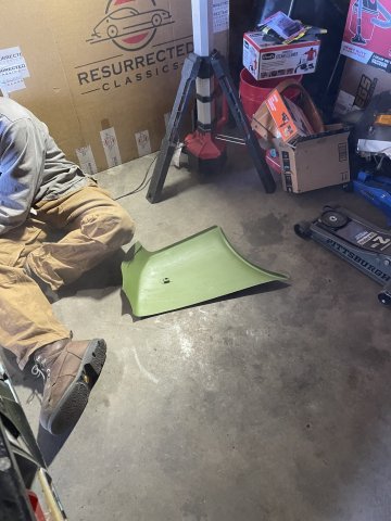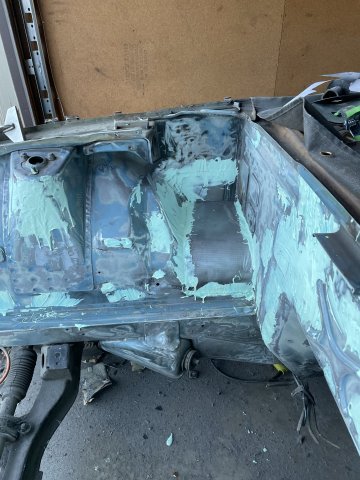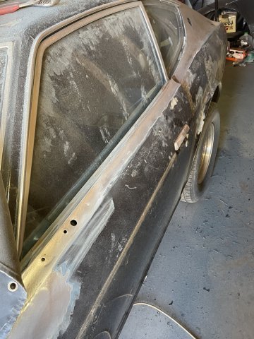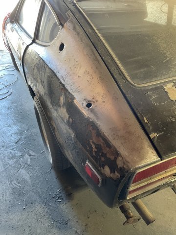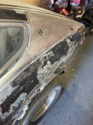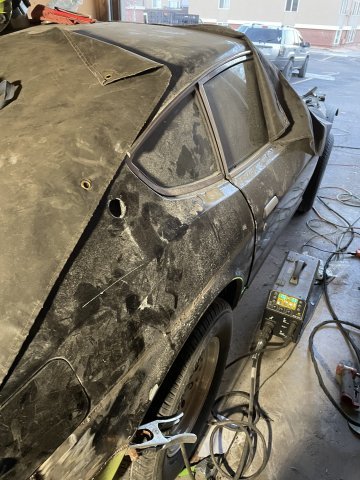 260Z Rust Repair Day. I had "The Floor Pan Man" from Denver come over and got all the rust cut out and welded up. In the process of doing that we found damage and THICK Bondo in the rusty area behind the passenger rear wheel. Through sheer luck the Klassic Fab Vintage JDM patch panel was high.....high enough to remove all the thick bondo, and the rust. Once removed, we found a vertical welded section that the original body man had made to straighten everything out. So, Corey was able to cut that open again, and get it all straightened out correctly AND replace the inner panel that was rotted away also. While he was doing that I tore drivers door window and mechanism out, and replaced it with a refurbished part from Adam Sylvester at Datsun Rescue. The window had been held up with duct tape for over 10 years, and getting that "goo" off the window frame took quite a long time with steel wool....the glass I was able to use a razor blade to get it 90% done.....more will have to be done later.....but the PITA job I was dreading is now finished. When the bondo was found, I took my angle grinder and flap wheel and started looking for other areas it might be hiding.....luckily their isn't any.....but the thick paint on the car is in such a condition, that I need to use the flap wheel to remove it all, and then step it out with finer and finer paper to remedy it. I also put the glaze on the places needed in the engine compartment....doesn't look good. Why? Because the Dolphin Glaze I decided to use is "self leveling"....on vertical surfaces it "self levels" it's self down the panels! Not a biggie, it will sand smooth, but I don't want any more self leveling glaze! LONG DAY! Pics.