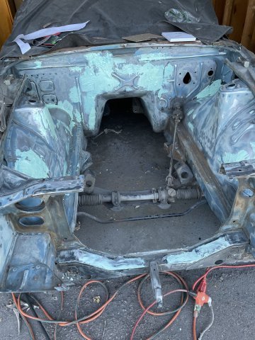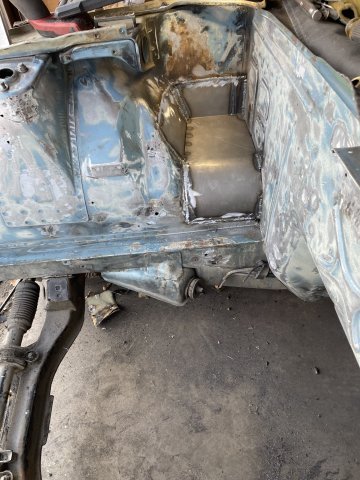 Today I got the motor mounts all done. I used my idea of holding a spare crossmember with spacers under the engine to make the mounts. 3 inches clears the steering rack with a hair of space. I used LS mounts I found on ebay for 32 bucks, and had to chop them up a bit to make them so they would weld over 1.4" steel plate that was cut and drilled to fit the 4200 block. The metal spans that it came with were too short, so I used a length of 3/16 steel bar and cut and drilled them. Then using the bolt, one at a time I pushed them up to the plate and used a sharpie to draw the angle then removed them and cut them down. You have to remember to mark everything so when apart, you don't get pieces mixed up, as the sides are not identical. After that, I boxed up my core transmission and then cleaned up a bit and headed to the other garage for 260 work. I ground off remaining brackets and other pieces that still needed to be removed in the engine compartment, then used a DA sander to get it all sanded down. The old paint etc....well 80 grit wouldn't even phase it, so I had to use 60 grit. I was able to get everything sanded down except for the corners and tight spaces. I have an elliptical sander I bought that I will use next to get all the corners sanded out with 150 grit, then go over what I finished today to let that 150 grit smooth out any sanding marks. After that, I will then slick all the panels with Dolphin glaze, and sand the entire deal in 220 grit. Then 3-4 coats of sandable filler primer to fill in any imperfections, then color, then 2-3 coats of clear. A lot of work, very dirty, but progress was made. Pics: