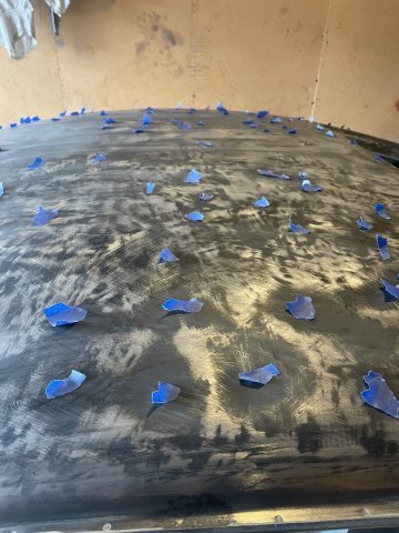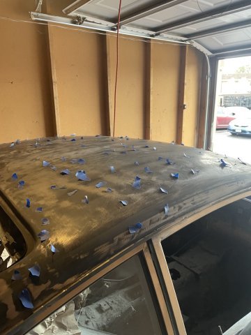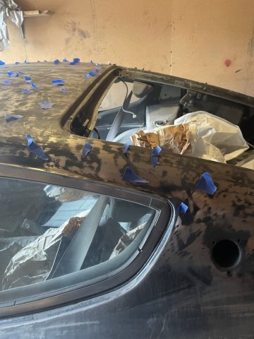 12-30-2025. The filler i had put on the roof of my 260Z never hardened up.....it just stayed "gooey", so this morning I went to it with a wire wheel attachment in my drill and got it all off. I then went ahead and sprayed some flat black primer on the roof and the sides a bit as well to go ahead and start blocking it out.