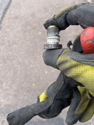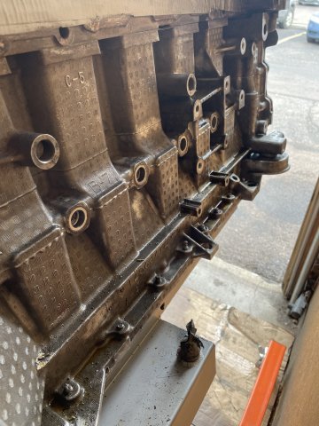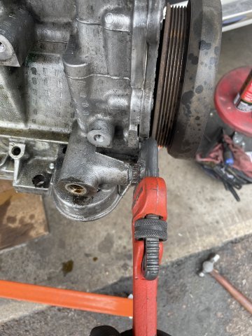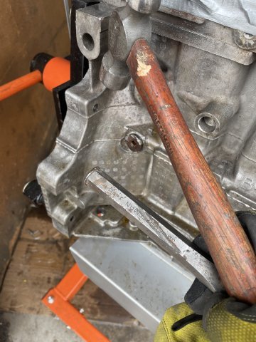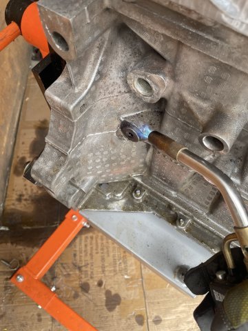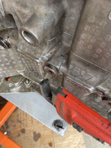 Today was a cold snap, but I managed to get a job done I have not been enthusiastic about doing..... removing the oil screw in plugs from the block. Metal plugs in an aluminum block and have been in there for 19 years. I had to use a pipe wrench, hammer, hex wrench, PB Blaster, a MAPP gas torch, and a cold chisel. I found that the cold chisel is the most effective at getting them loose and off, but it will take several cycles of PB blaster , spraying it where the bolt face touches the block and letting it seep in, and then MAPP gas (2000 degree F or close to it, maybe more) held around the bolt to heat up the aluminum and get it to expand, then hitting the head of the bolt a few times hard with the hammer, and then putting the chisel on an angle and beating on it with a hammer to shock it loose and turn it. These bolts are M16X1.5 thread, with the exception of the bolt facing the side at the oil filter. The bolt facing straight ahead is the same size, M16X1.5 but the one to the side where the sensor normally is..... is a coarse thread bolt, M16X2.0 thread. I have ordered brass plugs from Auto Meter to install into each port that are drilled and tapped with a 1/8 NPT center. I will put brass plugs in #1-3, #4 is for the oiling system re-route from the front facing port at the oil filter, number #5, the last port on the block at the very end is for Turbo oiling feed. The side port at the oil filter, the bolt will be drilled out in the center and tapped to 1/8 NPT so I can use it for an oil psi gauge. Sure feels good to have this done. In the pics you can see how the factory really gooped up the threads when they installed them. Pics follow. Cheers!