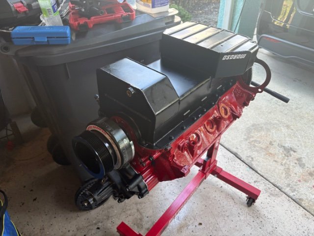 Screw up fixed, new oil pan is on. Had to modify windage tray for rear pick up to fit. Started on the harmonic balancer, not sure it’s on all the way, hopefully I’ll get a little more time tomorrow. -