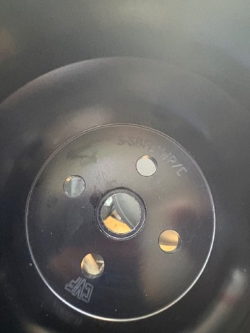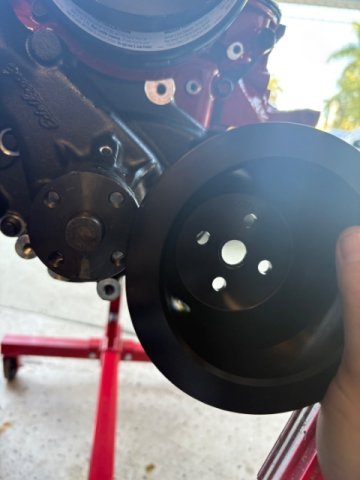 Snugged up harmonic balancer and installed pulley. Water pump pulley doesn’t fit, hole in center needs to be slightly bigger, about the size of that indentation. I’ll get that on another day. - Today