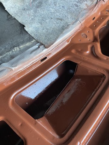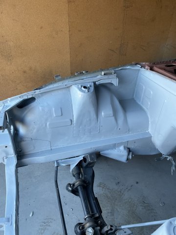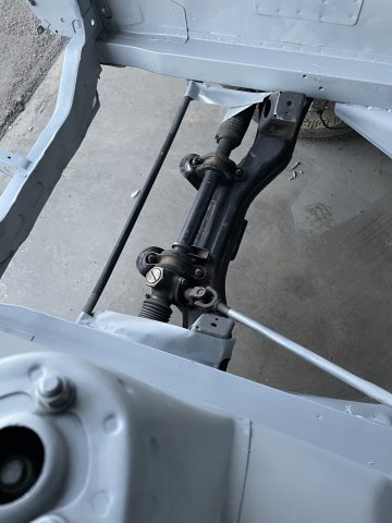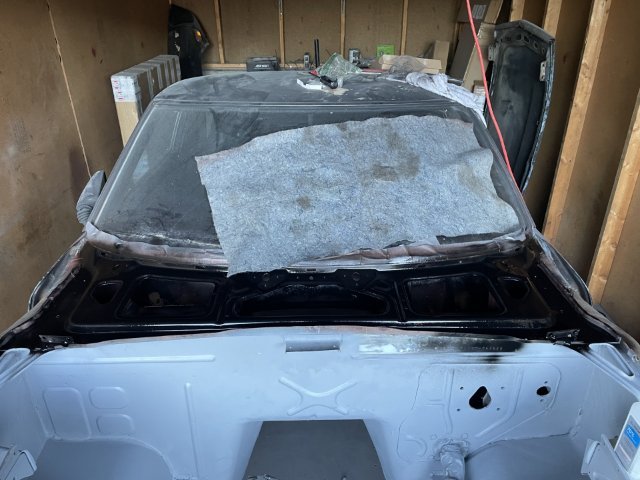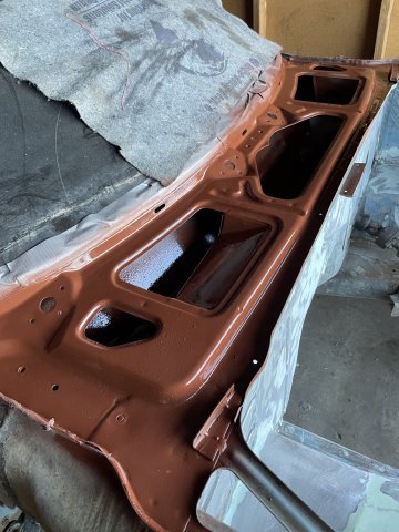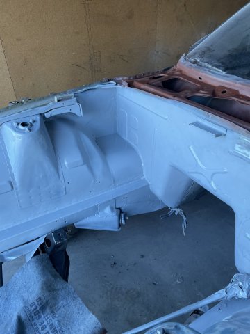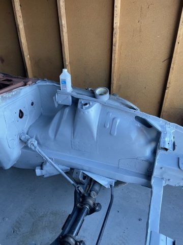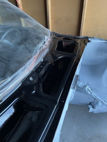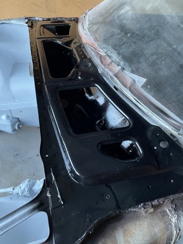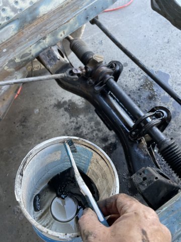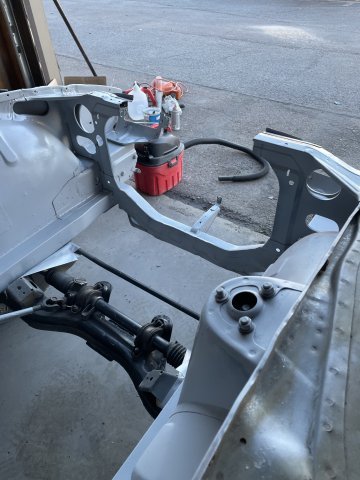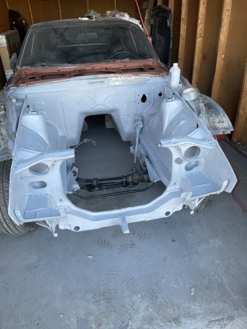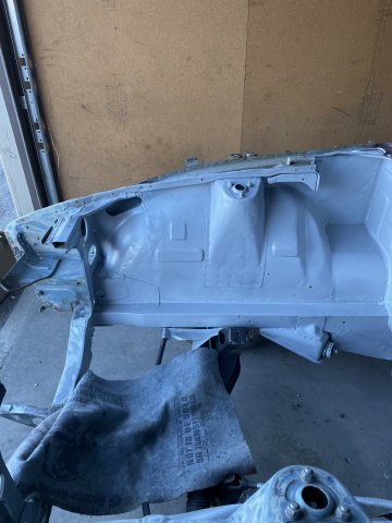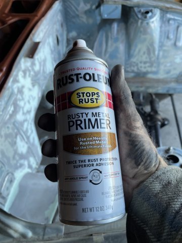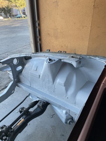 11-01-2025. 260Z work. I got the engine compartment sanded down after the glaze and then cleaned up the crossmember and rack with cleaning solution "g@s" and a toothbrush, and then steel wool, etc. Then I vacuumed out the cowl and primed it with rustoleum rust primerand top coated it with gloss black paint, then painted the engine bay with filler primer. Once dry I will use some spot putty I picked up on the areas that need it, hand sand it smooth and filler primer over that. Once it is good, then I will progress to color and then clear. Busy day! Pics: