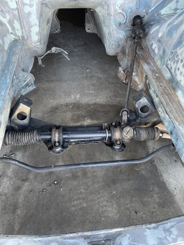 Today I got the motor mounts all done. I used my idea of holding a spare crossmember with spacers under the engine to make the mounts. 3 inches clears the steering rack with a hair of space. I used LS mounts I found on ebay for 32 bucks, and had to chop them up a bit to make them so they would weld over 1.4" steel plate that was cut and drilled to fit the 4200 block. The metal spans that it came with were too short, so I used a length of 3/16 steel bar and cut and drilled them. Then using the bolt, one at a time I pushed them up to the plate and used a sharpie to draw the angle then removed them and cut them down. You have to remember to mark everything so when apart, you don't get pieces mixed up, as the sides are not identical. After that, I boxed up my core transmission and then cleaned up a bit and headed to the other garage for 260 work. I ground off remaining brackets and other pieces that still needed to be removed in the engine compartment, then used a DA sander to get it all sanded down. The old paint etc....well 80 grit wouldn't even phase it, so I had to use 60 grit. I was able to get everything sanded down except for the corners and tight spaces. I have an elliptical sander I bought that I will use next to get all the corners sanded out with 150 grit, then go over what I finished today to let that 150 grit smooth out any sanding marks. After that, I will then slick all the panels with Dolphin glaze, and sand the entire deal in 220 grit. Then 3-4 coats of sandable filler primer to fill in any imperfections, then color, then 2-3 coats of clear. A lot of work, very dirty, but progress was made. Pics:
