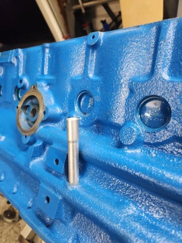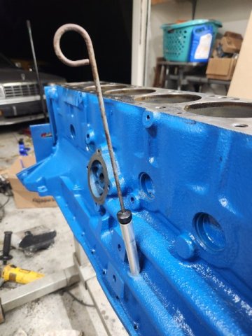 I started the day with some kitty litter and cleaned up a big oil spot from the gear oil int he transmission when I pulled her out....yeah I didn't drain it. So, the brass fittings I bought to go into the side of my 4200 block for the oil ports I bought from Auto Meter. They were almost long enough to thread in. Then I noticed there is a stepped portion at the base of the threads. I used my die grinder carefully and ground that down, then I was able to get them in and gooped them up with pipe thread sealant to make it worry free. Then I was able to locate a bolt that would thread into the port on the side of the oil filter boss. I cut it down so it would tighten up flush, then drilled the center out. Once I get my 1/8" NPT tap I will tap it and it will become the supply for an oil pressure gauge.