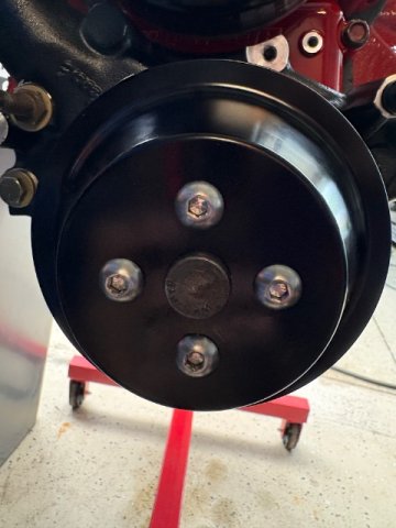 Snugged up harmonic balancer and installed pulley. Water pump pulley doesn’t fit, hole in center needs to be slightly bigger, about the size of that indentation. I’ll get that on another day. -