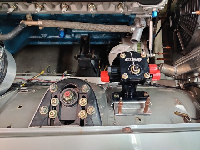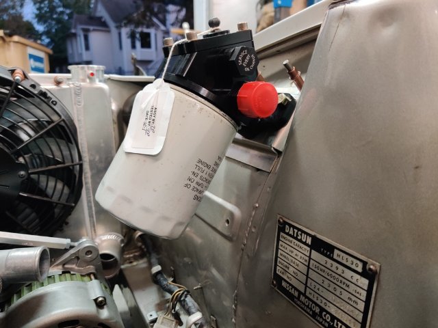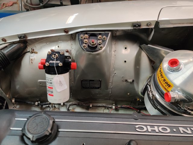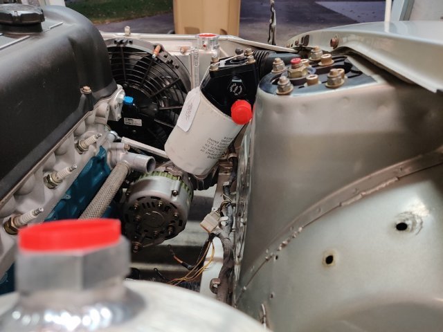 Next up is the oil filter remote mount. I fabricated an aluminum bracket to attach the mount to the right inner wheel house. On the 46 BRE Z, the mount is on the inside of the strut tower. I wanted it to be a bit more forward in the engine compartment, as I think that facilitates a slightly better routing of the line from the "out" of the remote mount to the input on the engine block. Essentially the line just needs to turn 90 degrees to go into the block, plus some angle to handle the height difference. Here are some pics from various angles. I am planning on running the supply and scavenge lines across the front of the engine at the front "cover plate" location, where I am running a Kaminari timing chain tensioner. I could fabricate a bracket to mount the oil filter more vertical than I have done here, but I chose this angle to keep the outlet tangential to the shock tower innermost surface. I plan to secure the hose with a rubber lined "P clamp" at the shock tower and then bend the hose for a straight (ish) run to the block. I also am thinking that angling the oil filter out like this will allow me to run the scavenge line between the wheel house and the filter (in the gap that exists) and secure the scavenge line also to the shock tower with a P clamp. If the oil filter was vertical instead, the scavenge line would have to pass by the filter on the other side, where it would be free floating - not as easily secured. That is my thinking anyway. I have never run lines like this for a dry sump system. So, doing what I think is best.