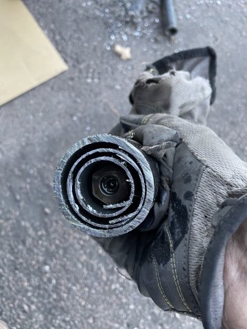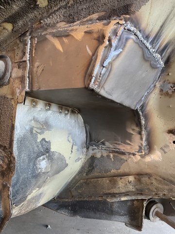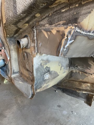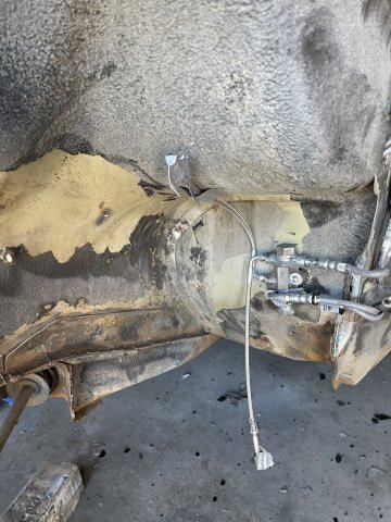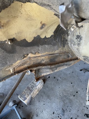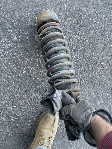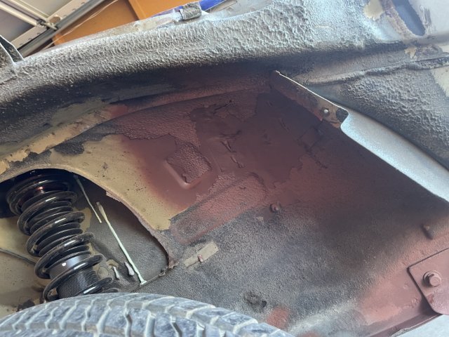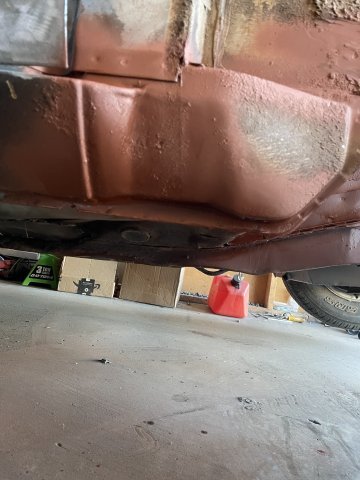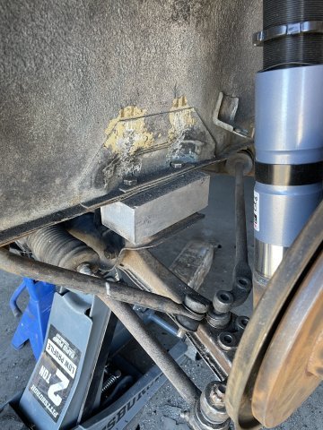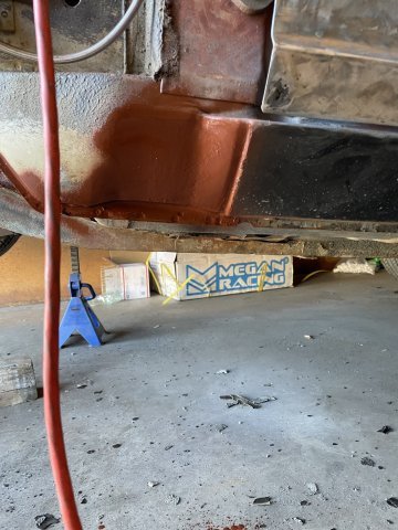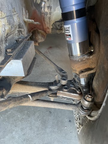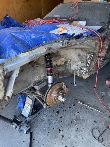 11-22-2025: Today I finished getting the front end together, as least enough to roll it around. The shims between the frame and rails are really aluminum blocks. I started with a 2 inch thick block, minus the factory plate I removed so they give about a 1 7/8" drop to the crossmember and engine. This is to get a starting point. With the front end together, I have 2 3/4" worth of adjustment left in the front struts to lower the nose down further with these plates in there. I have at least 4 inches if not more of clearance between the bottom of the cross member and the concrete. I installed some 1" thick bumpsteer spacers, and from the pics you can see the bottom arm is level, so pretty good for a starting point. I will now work on modifying the motor mounts to drop the engine 1-1.5 inches and see how it goes. With the block in there, and lowering the motor mounts, I believe the engine will fit completely under the stock hood. However, it will be necessary to get longer bolts and put spacers between the TC rod and arm to get the TC rods to bolt back up, and the sway bar end links were shot anyway, so they need replacement. I found that with the bump steer spacers, the factory wheels hit the steering rack end links. With the factory wheels, you would have to run wheel spacers for clearance, as even after grinding the ends down, they were still hitting.......will my 16" wheels clear? will be interesting to see. After this I removed some of the remaining factory undercoating that was peeling off and spot painted some spots with rustoleum primer to keep things from getting rusty. the pale yellow you see in the pics is actually the factory metal primer!! I then jacked up the rear, and removed the wheels, the 3 nuts on the top of each strut and then stood on each drum dropping and pulling out the rear struts. Because of their length, I had to go ahead and chop them in two in the car to finish getting them out. hydraulic fluid leaked and made a mess, but I got them out and after a cleanup with some shop rags and g@s, we are back to making progress. I have a mobile welder coming soon to weld on the collars in the rear and then I can put the rear suspension back together and get the car back up on 4 wheels. At that point, it will be time to pull the windshield and remove what's left of the paint and start prepping the Sheetmetal for the body and paint guy. PICS: