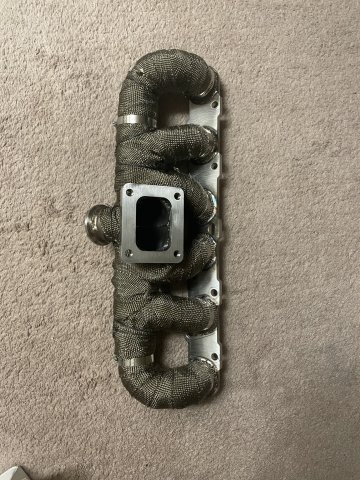 4200 Progress, 10-08-2025: Finished the cleaning of the engine today, using a can of gas (not recommended) and an old toothbrush and a shop cloth to wipe it up, razor blade on gasketing surfaces and other spots as needed.......then I mocked up the turbo header and turbo.....yep, my turbo is a bit bigger than what was expected I guess. I can get some space with another flange stacked up with the aluminum plate gasket for the second one, will probably need to put a wrap of header tape just in that spot as well. Also have a small boss sticking out on the head touching the compressor housing. I can just carefully grind it down a tad for clearance. Big T-76 turbo sticks up there huh? Good thing I will run an intercooler huh?