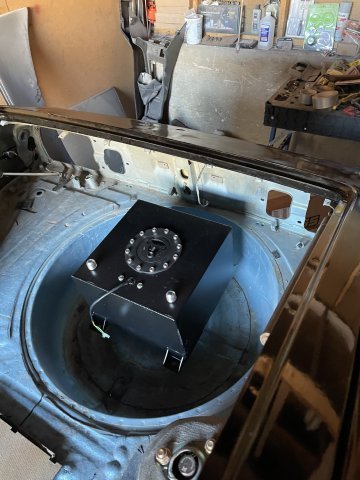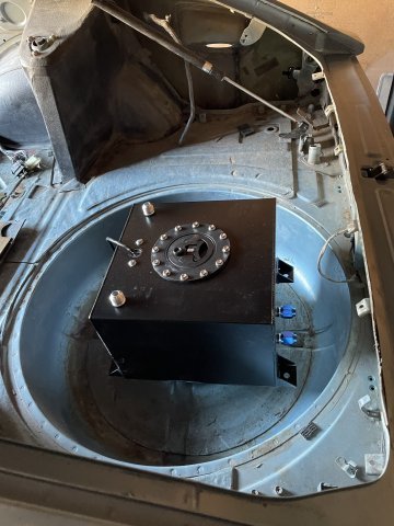 01-21-2026 UPDATE: I started the day vacuuming out the entire interior......A ton of bondo dust, and junk.....finally got it out. Later I will just have to mop it out and a light vac and it will be okay. I then installed my quarter windows, the drip rails, and the rear hatch. Installed the inspection doors and then installed the new parking lamps I got off of eBay, the sail panel emblems, and front fender emblems. A tad bit of clear caulk to help keep them tight against the metal like I want. I was also able to clean out the garage, throw away a lot of stuff no longer needed, empty boxes, etc. I set the 5 gallon fuel cell in the spare tire well for a quick look, it will be on a rack holding it up a couple inches and offset towards the driver's side to offset the weight of the battery which will be to the right of the spare tire well. PICS: