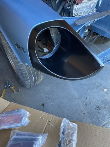 11-28-2025. I started today by sanding out and using some filler glaze on the left headlight bucket, and then sanded down both front fenders. Then I finished scribing out the hole on the hood and cut it. After that, I went ahead and primed and painted the front fenders and the one headlight bucket I currently have. There are 5-6 spots I will have to fix / paint correct, but progress is made. Pics: