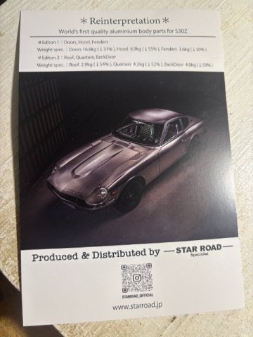 Aluminum Body Panels of 240Z manufactured in Japan These 240Z Aluminum Body Panels are originally manufactured by Yahagi Industry Company in Japan. They will be marketed by Star Road Specialist in Tokyo, Japan. The body were installed on a private owner's car for the Sema Show 2025. I hope they have a video of the installation process so we can see how to done. That way, potential customer can determine whether their body shop can duplicate the installation. Working with Aluminum is not an easy task and requires some specialized expertise and tools. This vehicle was on display at the Toyo Tires Booth at Sema. Pic of Hood Bottom of the Hood the Hood Skin was riveted to the Hood Ribs. the Engine was a Turbocharged Nissan Motor. View of the Front End Rear Hatch Lid Right Side Door Rear End Panel Roof Panel Left Rear Quarter Panel Right rear Quarter Panel and Fuel Tank Door Left Door Left Rear Quarter Panel Left Front Fender Front Cowl Section Front Grill Section Headlight Section Information Sheet Weigh Saving Information Card These Aluminum Body Panels are very well made and looks great. It will provide a another option for restoring 240Z and save many Zs from being scrapped. i talked to the guys who actually manufactured the aluminum panels with the little Japanese that I know. They told me that right now, they plan to run only a Production Run of 100 body panels. Star Road is handling the sales side. But they would not give a price yet. I think they are waiting till the Tokyo Auto Salon Show occurring in January 2026 in Tokyo. -