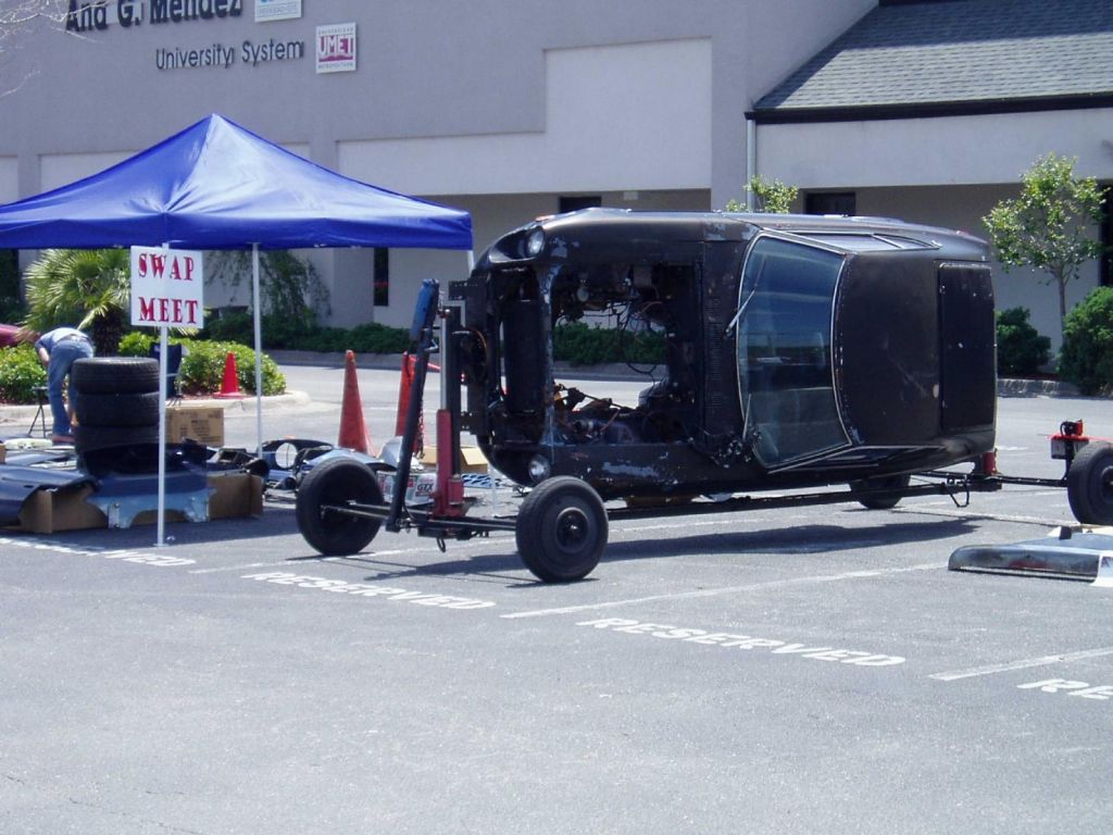 Photo of a Rotisserie with 2 engine hoist jacks operated by air and a flexplate crank used to rotate the car 360 degrees and lock it in a particular position. Also 4 wheels and a tow hitch to take the car with you to the shop or home.