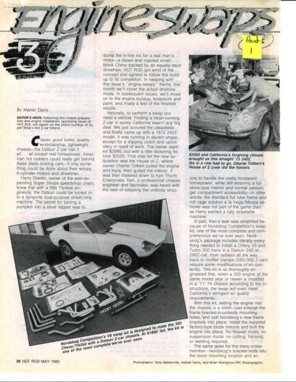 Project 240 Z28 - Hot Rod Magazine article - June and July, 1985 - p. 1 of