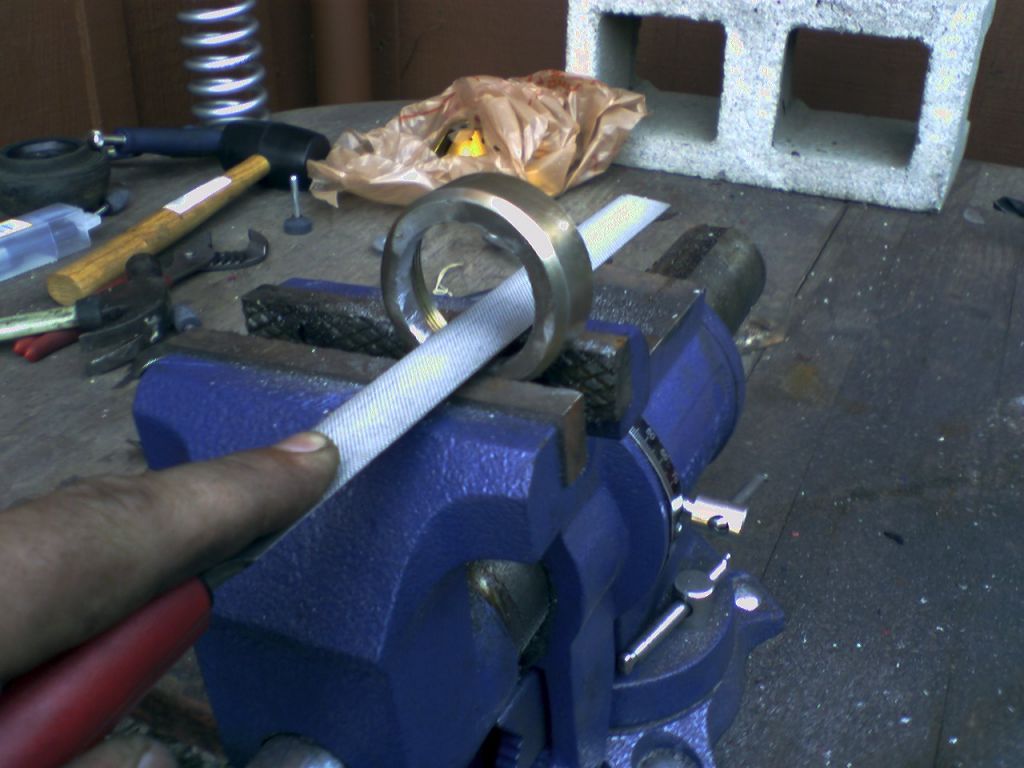 Using the round file, file the inside of the carrier down until the damper body can fit through it easily.