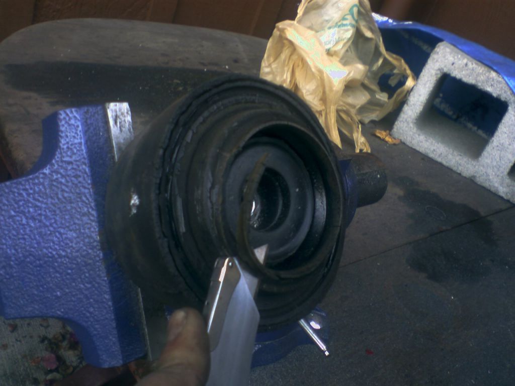 Put the strut-top in a vice, and using a stanley knife, trim the downwards-protruding rubber lip off 6mm (1/4").