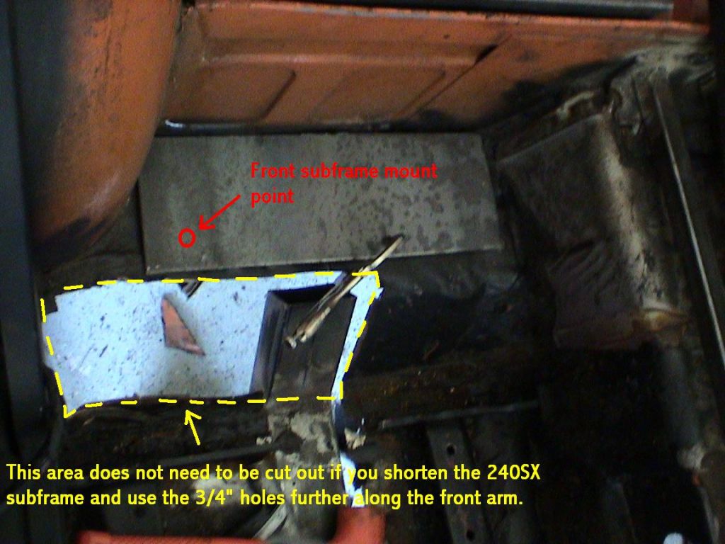 This view is from above and shows where you will need to reinforce the floor for a mounting point. I welded 1/8" plated over the existing floor and tied it into the frame I built that runs longitudinally along the car.