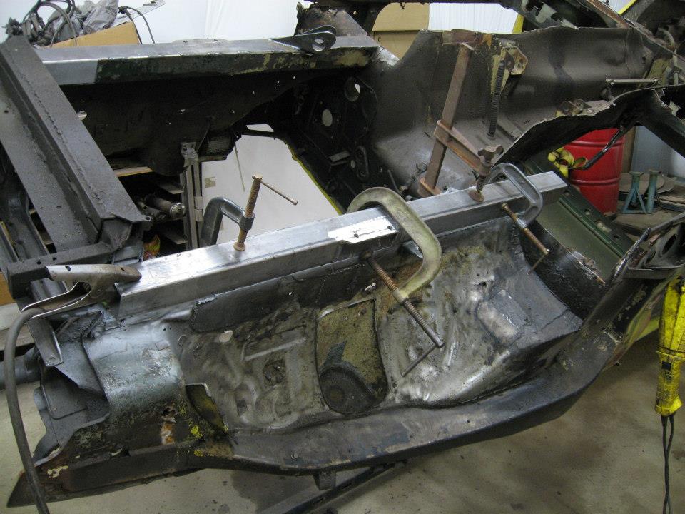 New rail with cross member mount being fitted up. Also, both floors fully removed.