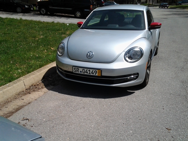 My new DD, VW Beetle Turbo with red rear view mirrors + an euro transport tag