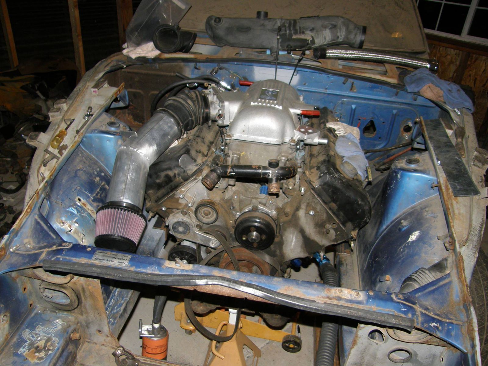 The engine is mounted on custom crossmember/engine mount