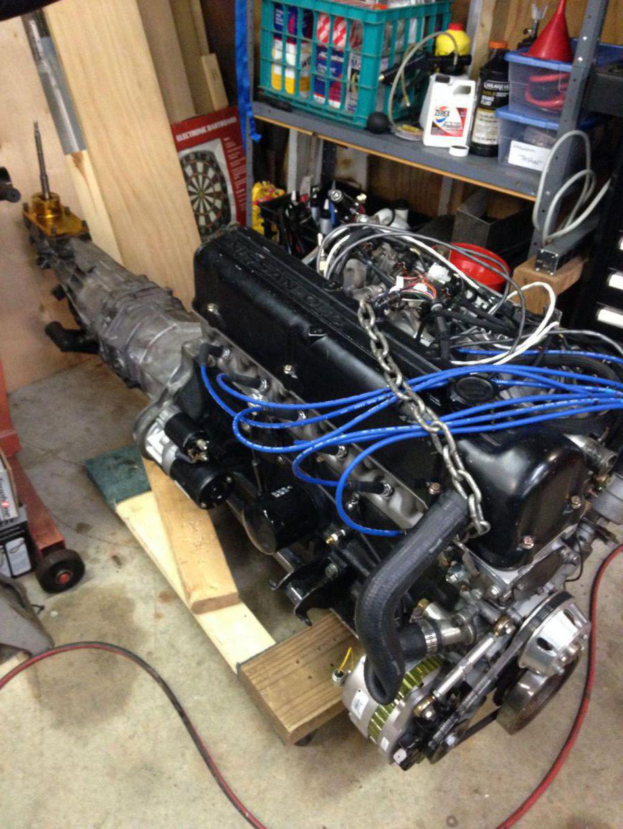 There she sits… the power plant! Rebello 3.2 with a 240sx trans bolted up