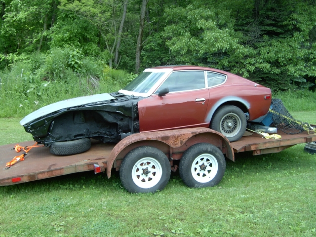 77 280Z at my mom's before going in the barn. The POR15 is visible on front clip. Anyone do trailer blasting?