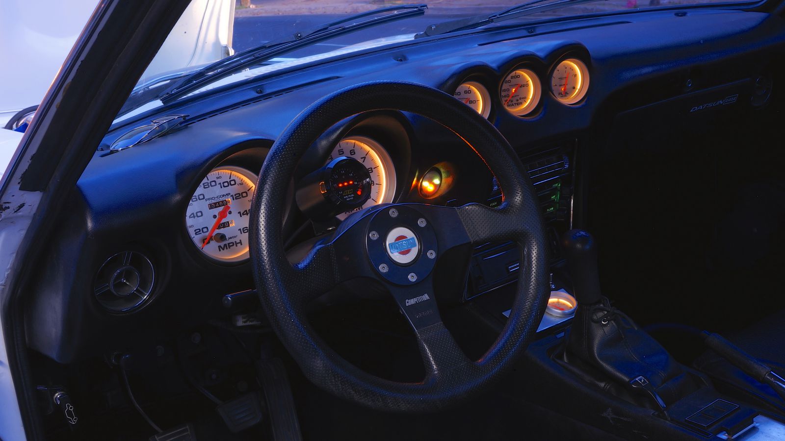 Showing the illumination of the Auto-Meter Ultra Lite gauges in my dash. I also have a 52mm volt gauge mounted into the fuse cover by the shifter, and turn signal and high beam indicators where the cigar lighter used to be. The gauge on the steering column is an AEM UEGO wideband, to help me with carb tuning.