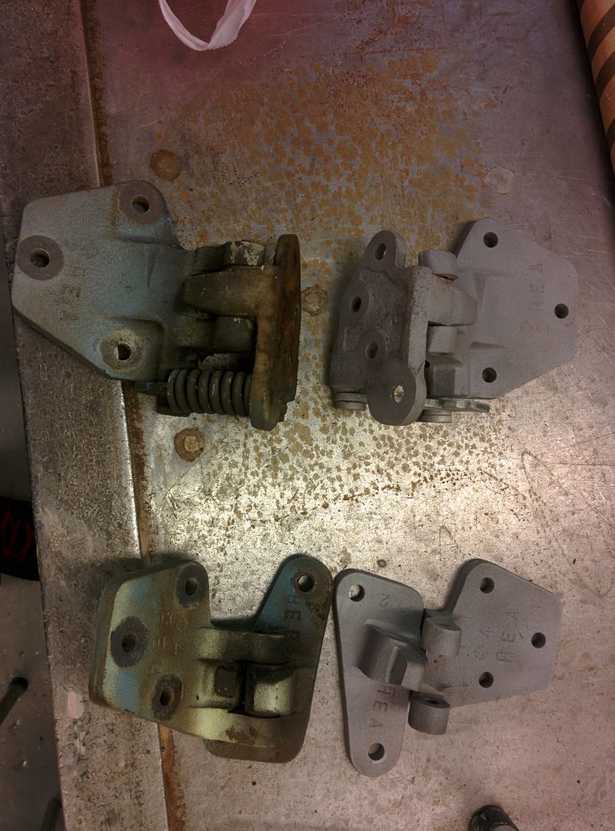 Hinges removed, disassembled and aluminium oxide blasted. Next powder coat and reassemble with new taps, bushings and grease. I also had to make new hinge detent roller for the other hinge beacuse the original was in peaces.