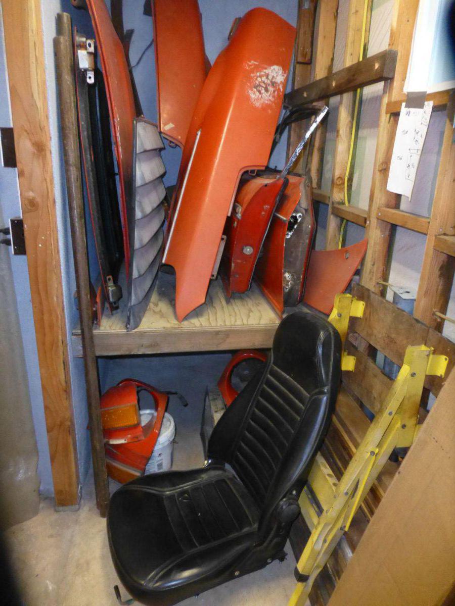 Since I only a two car garage I had to build a parts storage area. The shelve is about 48" X 43" out of 34" plywood. It is supported by 2" X 4" anchor bolted into cemete wall. Top shelve to hold hood, fenders, doors,