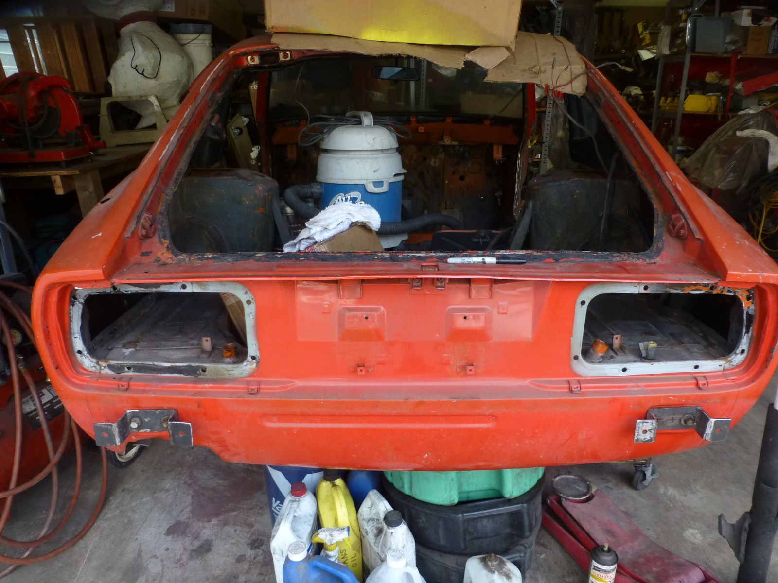 stripped out rear of car-interior panels,carpet,taillight assemblies,fuelntank and wiring harness