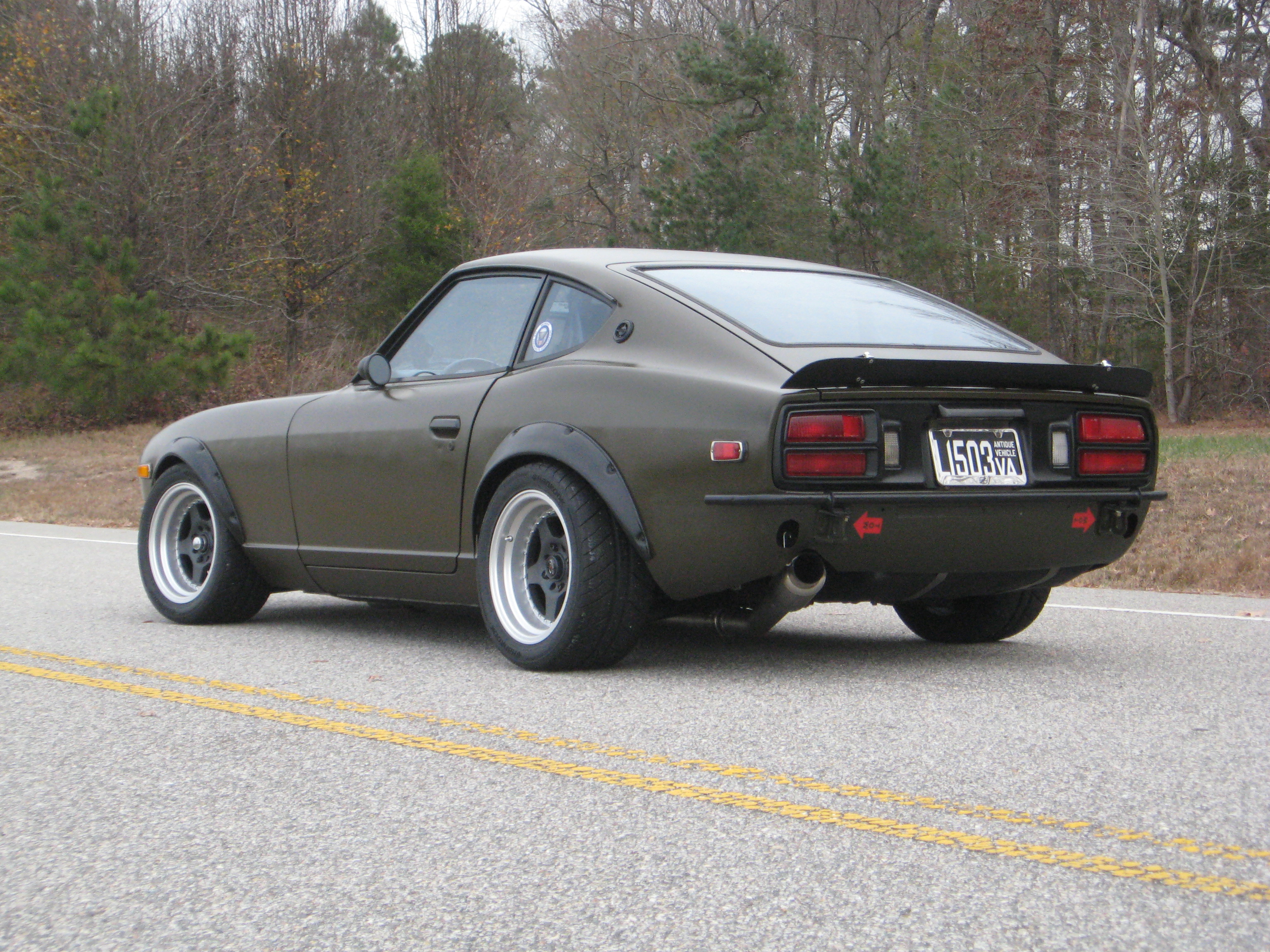 Early-model 260Z (production 11/73) with warmed-over SBC. Custom front lip and adjustable rear spoiler. Custom front and rear bumpers and bumper mounts. Retro-Spec flares. Rota Kyusha 15x8 with Hankook RS-4 245/40-15 rubber (Hoosier 275/35-15 race rubber). Thanks for looking.