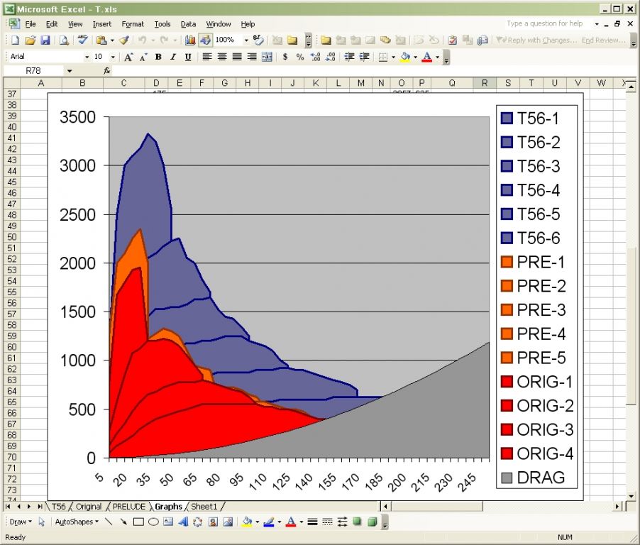 I made an excell spreadsheet with wheel torque vs. RPM for every gear and graphed it in an area graph. Then I compared the original engine and original gearing from a dyno and normalized it with my newe engine. Then I took an estimated drag coef. based on the alleged maximum speed of a stock z-car using CX^2. And graphed that too. I got a pretty cool picture. It's a warm fuzzy.