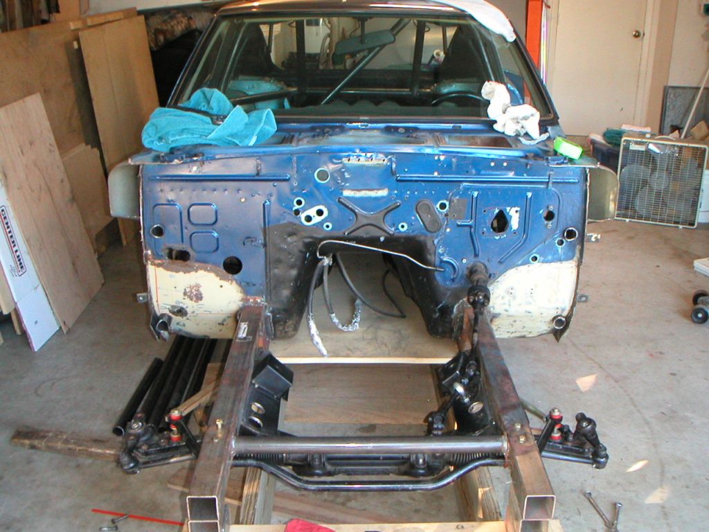 This photo shows the car after I cut off the original front end. The wooden structure holding the car was made to fit tightly betwee the original frame rails and extended back past to point "C" as shown on the factory frame drawings.