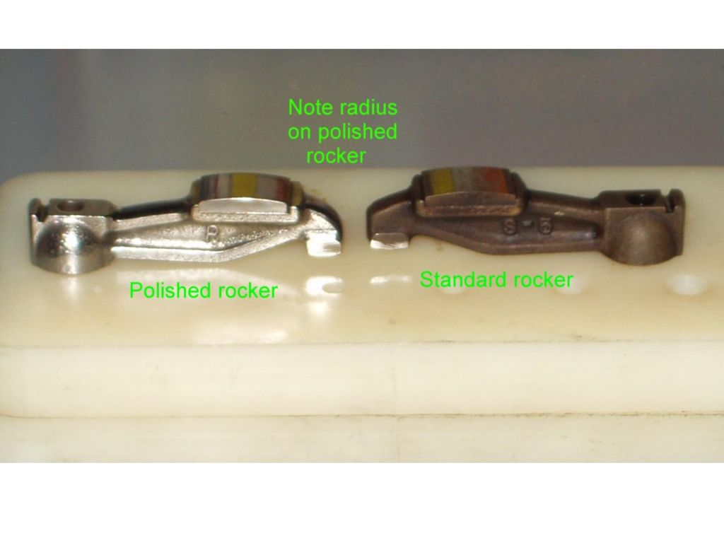comparison of stock rocker with lightened, balanced and polished rocker.