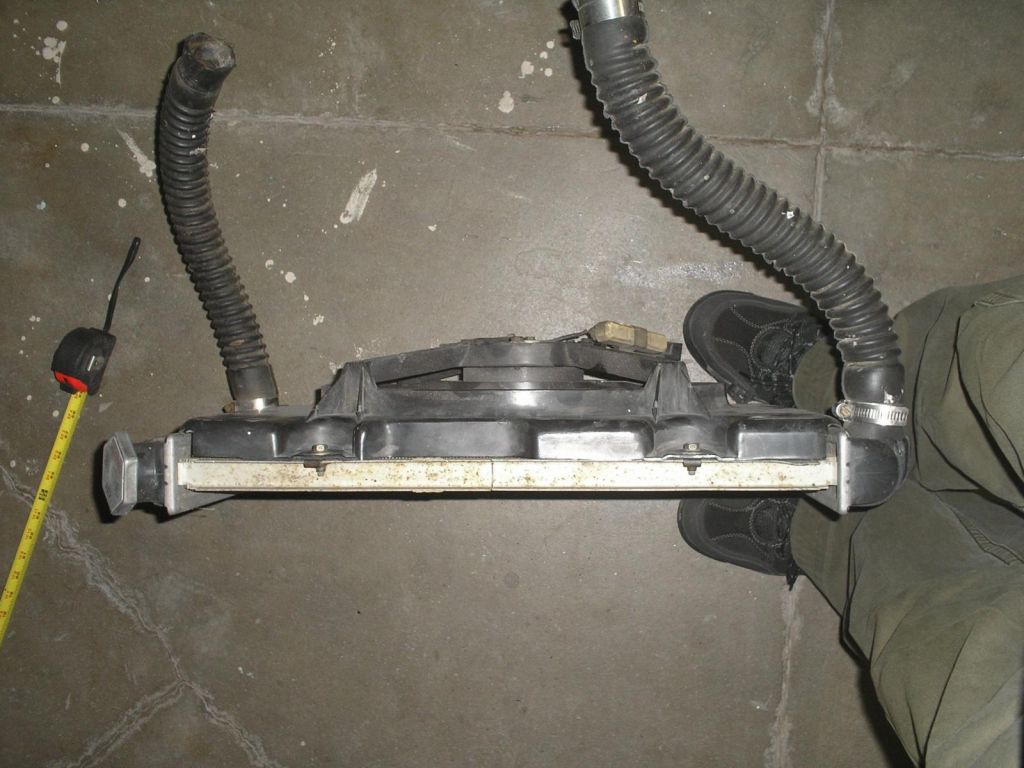 Fiero radiator from the top showing the attachment of the fan and shroud, the total thickness is 6".