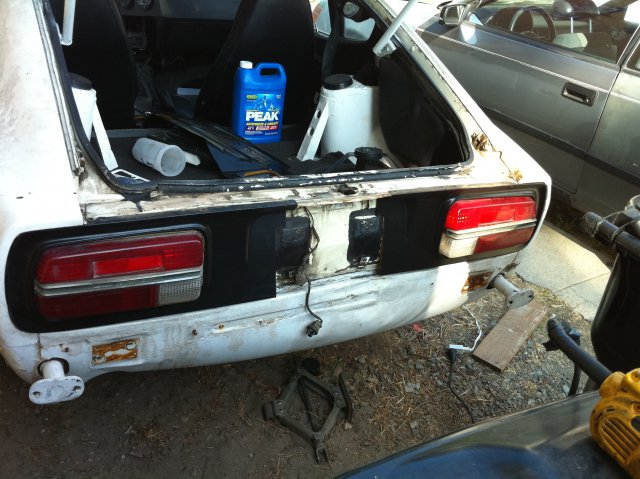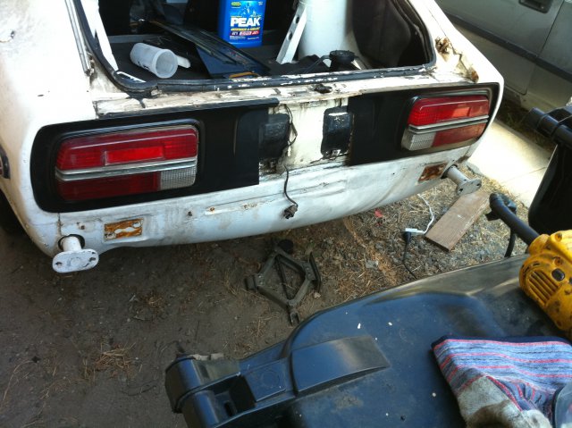 Hey HybridZ, I own an early 260z (8/73) and love the car. It is going to a bodyshop for restoration, but before it left I wanted to put some 240z lights because I love the way they look. I do like the 260z/280z tail lights but when I found a great deal for some 240z lights I couldnt pass up. I have searched thoroughly and have not seen a write up. I wanted to do something this Sunday as I am not a big fan of fotball, so I went ahead and removed the 260z tail lights I then test fitted the trim panels. (note those platic pins have to be removed) I then set up my weopons of choice, It was a drill and cutting wheel. I was ready to cut, I first used a sharpie and drew out the lines. It was simple to cut, nothing too complicated, The way I cut it was to make sure there was no round corners it all had to be squared. I cut till that point on the upper and lower portion of the metal. I test fitted and I needed to cut about a half inch on the upper side of metal panel so the 240z tail light housing can clear. It fit perfect. I then did a test fit with tail light first then with trim panel. I used the sharpie and pin pointed my holes. They were all different from 260z holes. They were nice and spaced out from exsisting holes. There was only one that wasnt but only needed a little trimming. They are from the upper left corner on the left hand side and the upper right corner on the right hand side. That was my start point for hole drilling. I was ready to install. The fit was perfect. The picture above is the left hand side finished and the right hand in the process. The light bulbs on my existing 260z did fit in the 240z tail light housing. They just needed some mixing and matching. They did light up but have no picture since it was already dark and rainy. I should have picture of lighting tomorrow. Here is the Finished product Well, it is semi-finished I just need to remove and clean. Then the car goes to restoration shop. note: I do have the middle piece which goes on tomorrown when I clean it and paint it. The holes on middle piece do match the holes of the 260z piece. There is no mod there just install License plate. It was fairly easy. The only real hard part was to remove 260z tail lights. It took me a little over 3 hours to complete.