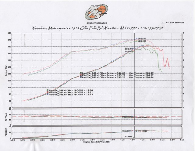 The Dyno session went pretty good. I got my VE table set for WOT. I learned a lot and the car made more power than I expected, but it also revealed a problem. Here is the chart: AS you can see It made 253 HP and 280 lb ft of torque. But you can also see that it really dropped off around 5000 RPM. At first we thought it was detonation, so I backed the timing off from 21 degrees under boost to 18 degrees to see what would happen. It did the same thing. The AFR's were solid even when it started missing and dropping out so we checked the plug gaps, they were nice and tight. So we were scratching our heads for a few minutes and we decided to check the datalog to see what the battery voltage was like. I believe that is the problem. You can see that right about where the power drops off on the Dyno, the Battery voltage is dropping off to 11.6 volts. We believe this is causing the coil to not make a powerful enough spark and basically the boost was blowing out the spark. It also may have interfered with the injectors slightly by looking at how the Pulsewidth becomes unstable as the voltage drops. Here are a few snapshots of the datalogs of my pulls. The yellow line is the Battery voltage. I have the 105 amp alternator upgrade purchased from the Z man of Washington, and it is less than a year old, so we don't think that the alternator is causing the problem. We believe that the stock white/white with red wire is not up to the task of keeping the battery charged when both of my fuel pumps are at full song and the injectors are at a high duty cycle and the coil is firing rapidly. So what I'm going to do run an 8 or 6 gauge wire from the alternator + directly to the battery + with an 80 amp inline fuse and also change the wire feeding power to my megasquirt power blocks from 10 gauge to 8 gauge, and see if this solves the problem. I think I will also install a relay for the coil + side so that the coil can draw power directly from the battery instead of through the stock ignition switch.