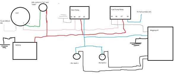 I mispoke about cranking RPM. What I should have said is that if the cranking RPM is set too low in Tunerstudio/Megatune, then MS won't fire the injectors at the cranking pulsewidth. IF your cranking RPM is 135 RPM, then your cranking RPM setting should be at least @ 200 RPM. Anything above what your cranking RPM setting is at will fire the injectors at whatever pulsewidth it derives from your table settings. Lets say your cranking RPM is set at 100 RPM... then at 135 RPM it will be trying to derive a pulsewidth from your table settings, which probably only go down to ~500RPM or so, so basically MS might calculate a 0ms Pulsewidth. See below for an explanation of the +12V to the injectors. I see the diagram you are using, it looks good... The thing is that in an S30 you have to wire the relays such as that they are active with the ignition switch at both the "on" and "start" positions. Basically you need to have pin 30 or 87 coming from a constant 12V source and the other going to the load (in this case the injectors), then either pin 85 or 86 hooked up to ground and the other hooked up to a switched 12V source. The only good switched 12V source I could find on my 240z was from the coil + side, this is hot at both the key "on" and "start". Almost every other circuit on a 240z is either constant 12V or is 12V when the ignition switch is at "acc" or "on" and are open circuits when the key is on "start" To clarify I made a quick diagram showing my relay wiring. I would also recommend testing your wiring by disconnecting the "S" terminal form the starter and then checking to see if you have +12V at the injectors with the key on both "on" and "start" Sorry for the childish looking diagram but microsoft paint is about the only way I have to make wiring diagrams