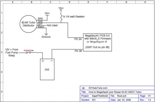 Where do you have the +12V for the CAS wired into? If it comes off of any circuit coming from your fuel pump relay then it won't receive power until MS see's a TACH signal (which it won't because the fuel pump relay won't be on.) Also If the power to the CAS comes from any circuit attached to the STOCK Accesory relay it won't see any power during cranking, even though it will see power when the key is set to the "ON" position. I see that you have the + side of your coil wired into the fuel pump relay... I'm not really sure if that is a good way to do it since that means that the coil won't receive +12V until a TACH signal is attained.... might make for hard starting. I have my coil + side wired with the stock wires going to it and only the - side hooked to MS to control spark. To check your CAS I would think you could use the following procedure: 1. Remove distributor from the engine. (I would also remove the cap and rotor and the plug wires) 2. Remove the fuses to the fuel pumps and injectors ( so you don't flood the engine.) 3. Disconnect +12V from coil ( so you don't shock yourself or start fires from the arcing) 4. Turn key on 5. Take a voltmeter and attach the + lead to pin #24 of the DB37 connector and the - lead to a good ground. 6. Have an assistant spin the distributor by hand 7. You should see a change in voltage on pin #24 every time one of the six slots passes under the optical sensor ( assuming you have it wired correctly and it is a non-defective unit) 8. If not then I would assume you either have a faulty CAS or you didn't wire it right. 9. If it checked out good on this test then I would disconnect the "S" terminal of the starter and do the same procedure with the key on the crank position to make sure that it works while cranking too. EDIT: Actually since the DB37 will be disconnected from MS during this test is really shouldn't be neccesary to remove the fuses to the fuel pump(s) and injector or the wiring to the plus side of the coil. So if you want to you can ignore those steps.