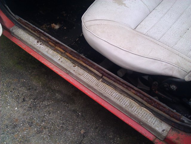 I don't know if that picture is very good, but both door sill lips are covered in rust. All weatherstripping has disentergrated and rain water has seeped into the cabin on the lower door edges. Also, when you lift the hatch you can see rust possible bubbling(?). You can't see it with the hatch down.