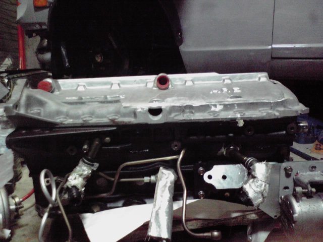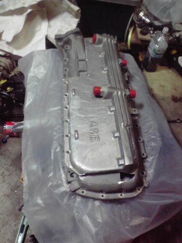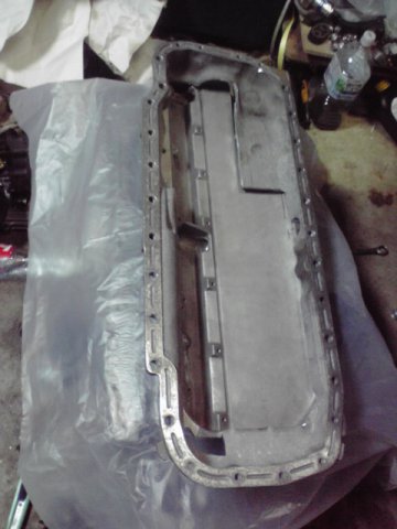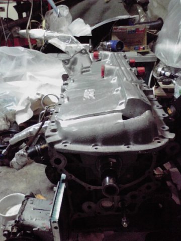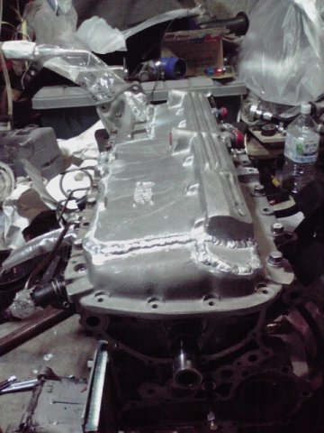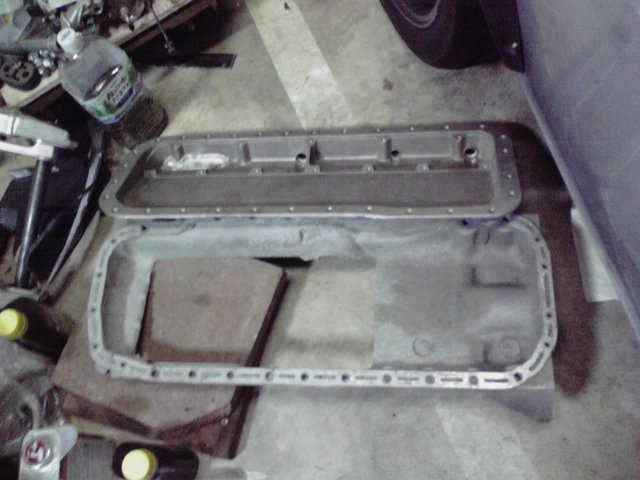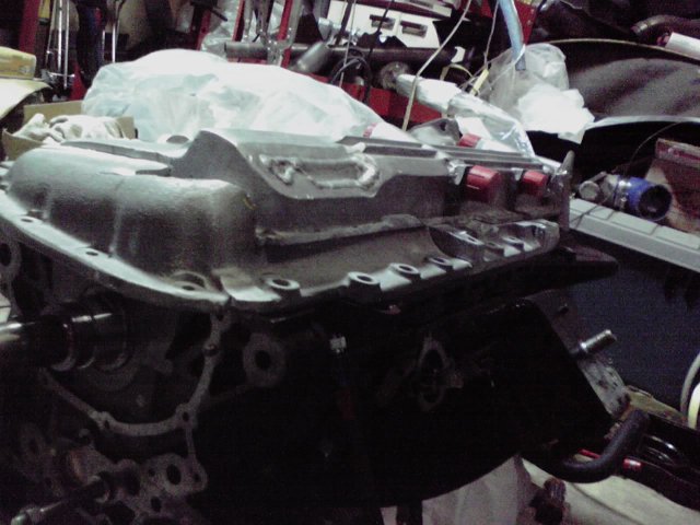 Making of dry sump pan. Rough cut of the l28 oil pan. Rear scavenge fitting will hit the RB26 oil pan. I spent all day for trimming and the result. This L28 oil pan was actually from the Electramotive 280zx turbo. -