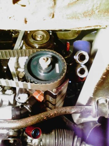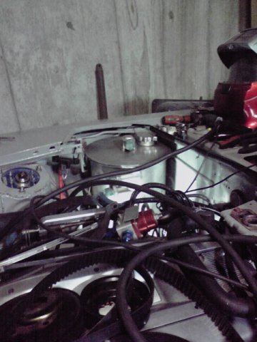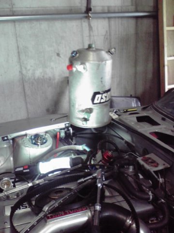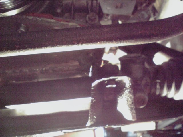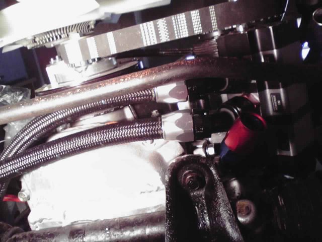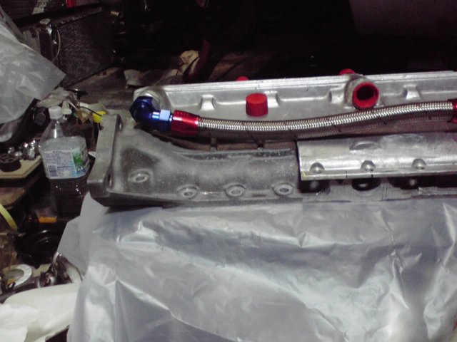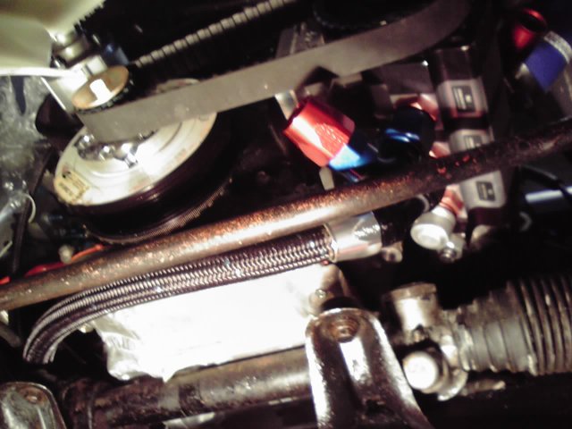 Trial fit. Steering rack clearance is hair tight. I'll put some spacers between mount and rubber. Plumbing of oil pump input. Interfere with the sway bar. Pump was relocated with more tilt. The scavenge lines clears the bar. Hose end of the pressure in only be placed at opposite direction. pic from underside. Pump out lines just clear frame rail. The car still has a room for an air conditioner compressor. Radiator fan clears the oil pump drive pulley by putting a spacer. -