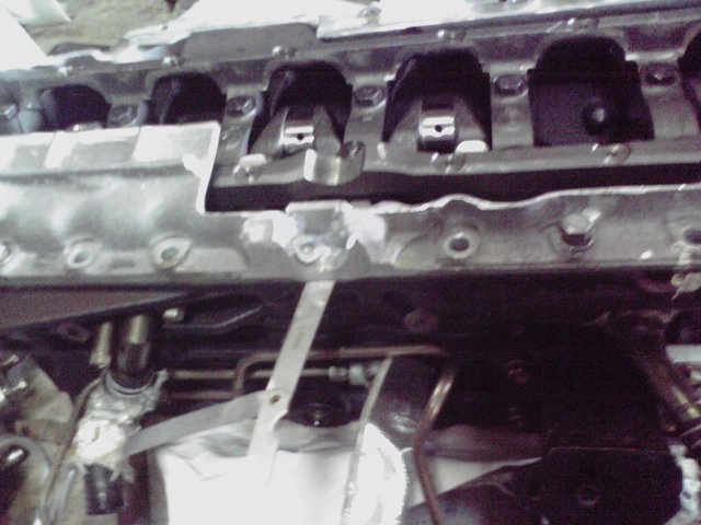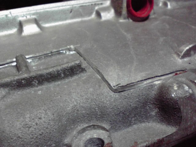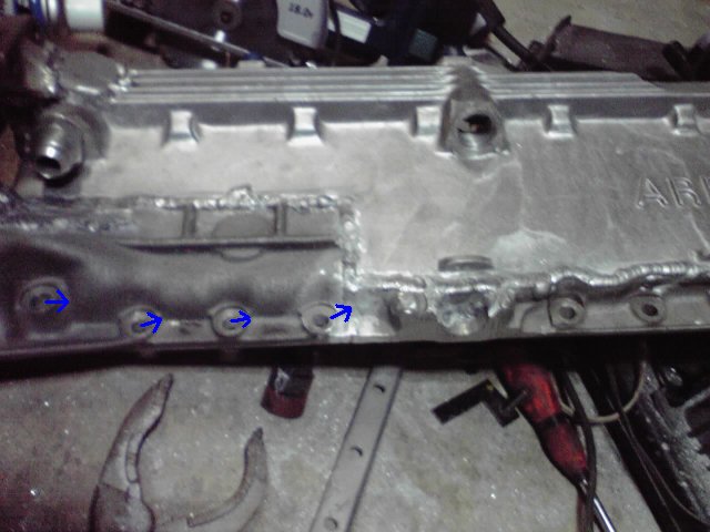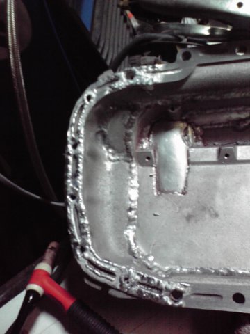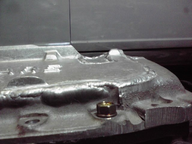 TIG welding Warming up is necessary because I doesn't TIG welding regularly. This portion does not cause oil leak. Next I weld a piece where the drive shaft was located. As expected by its shape, the mating surface warped. Thickness gauge was put under the warped area and put some bolts next there, and heated by TIG torch. The warp solved. Then I welded outside. Again, the warp occurred. Pan was removed from block and welded inside. Immediately the welding was finished, the pan was put on the block again with the thickness gauge where the warp occurred. I leave it until next weekend. -