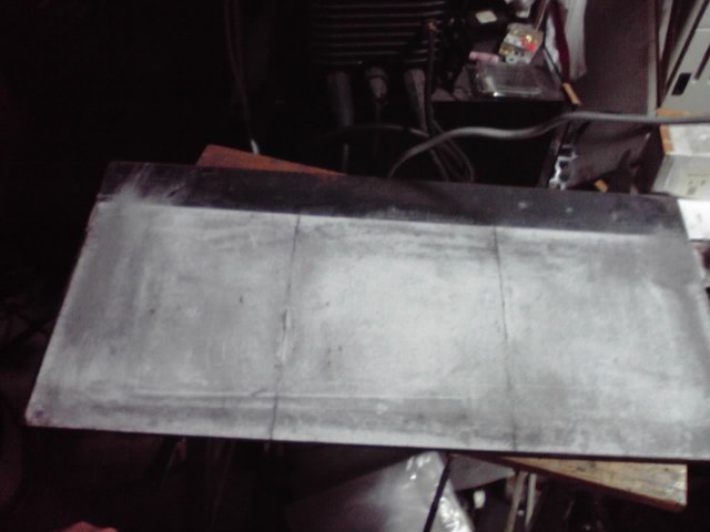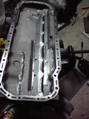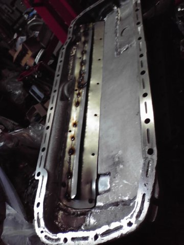 Finalizing the pan. Recess for steering rack. I tried to get it straight by milling on emery cloth. Instead, filled by welding on the mating surface of the warped area. Then sanded on the emery cloth for a couple of hours. Baffle was made by steel. It interferes with the rear part of the crank cap ladder. left side flange is shrunk by welding. Some bolt holes should get milled. -