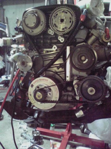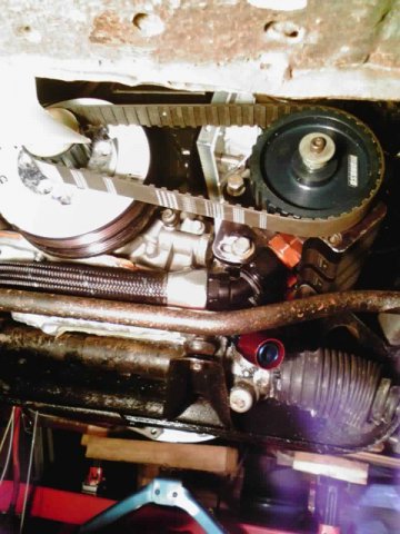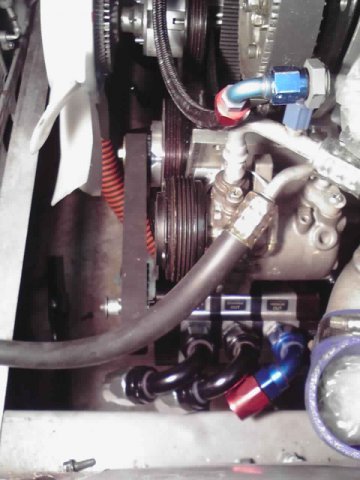 Dry sump pump is in. The bracket is test piece because I can't trust TIG welded aluminum. Oil pump belt tension is not adjustable. Compressor is relocated about 1" toward the rear. Belt tension adjustment range is about 1/2" because the compressor hits against the turbocharger intake pipe. -
