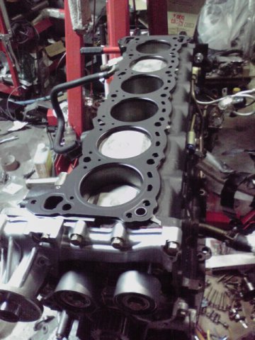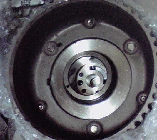 Block and head were washed with Simple green. Reassemble with new piston rings, main/connecting rod bearings and new head gasket. Head bolts couldn't be torqued properly. Forget to clean the block threads. Chased with tap. At this time I don't want to let VVT worked. NVCS cam and pulley are there because stock of BNR34 intake cam was in bad shape. I got a HKS v-cam step 1 type A. HKS v-cam is basically identical to Subaru AVCS system. My Link G4 Extreme ECU can control AVCS. v-cam fit in the Subaru cam pulley, however, the oil seal diameter is larger by 2mm. -