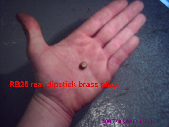 2- Rear "blank" hole brass plug. You hammer this one out with a punch from underneath and reuse it to plug the, now open, front dipstick hole. (R32-33-34, RB20-25-30 + 26 Vs. Z31 200ZR RB20DET)